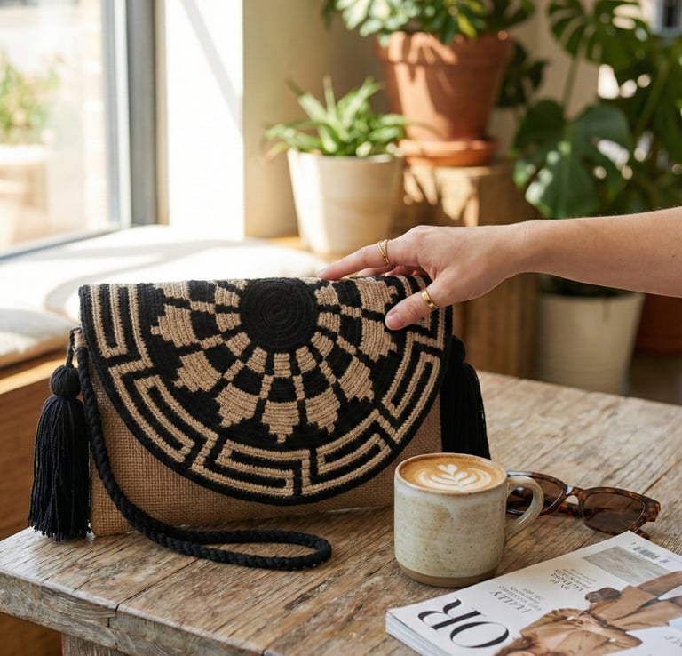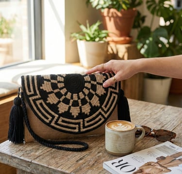 Carry the night. The Lunar Envelope is designed for the woman who demands elegance without compromising on heritage. This architectural piece redefines the clutch, blending sharp geometric contrast with the soft, organic soul of Colombian hand-weaving.