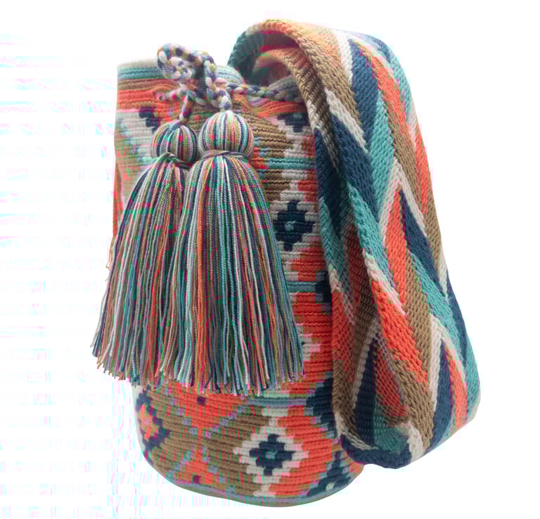 Wear the energy of the sun. The Aurora Prism is a masterclass in artisanal complexity. With its intricate diamond motifs and a kaleidoscopic palette of coral, teal, and mustard, this mochila is designed to be the undisputed focal point of any high-end ensemble.
